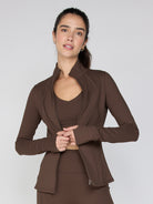 Sport + Lifestyle Details: Features a high collar, thumbholes for coverage, and secure zippered pockets, making it ideal as a gym jacket, running jacket, or stylish travel layer.