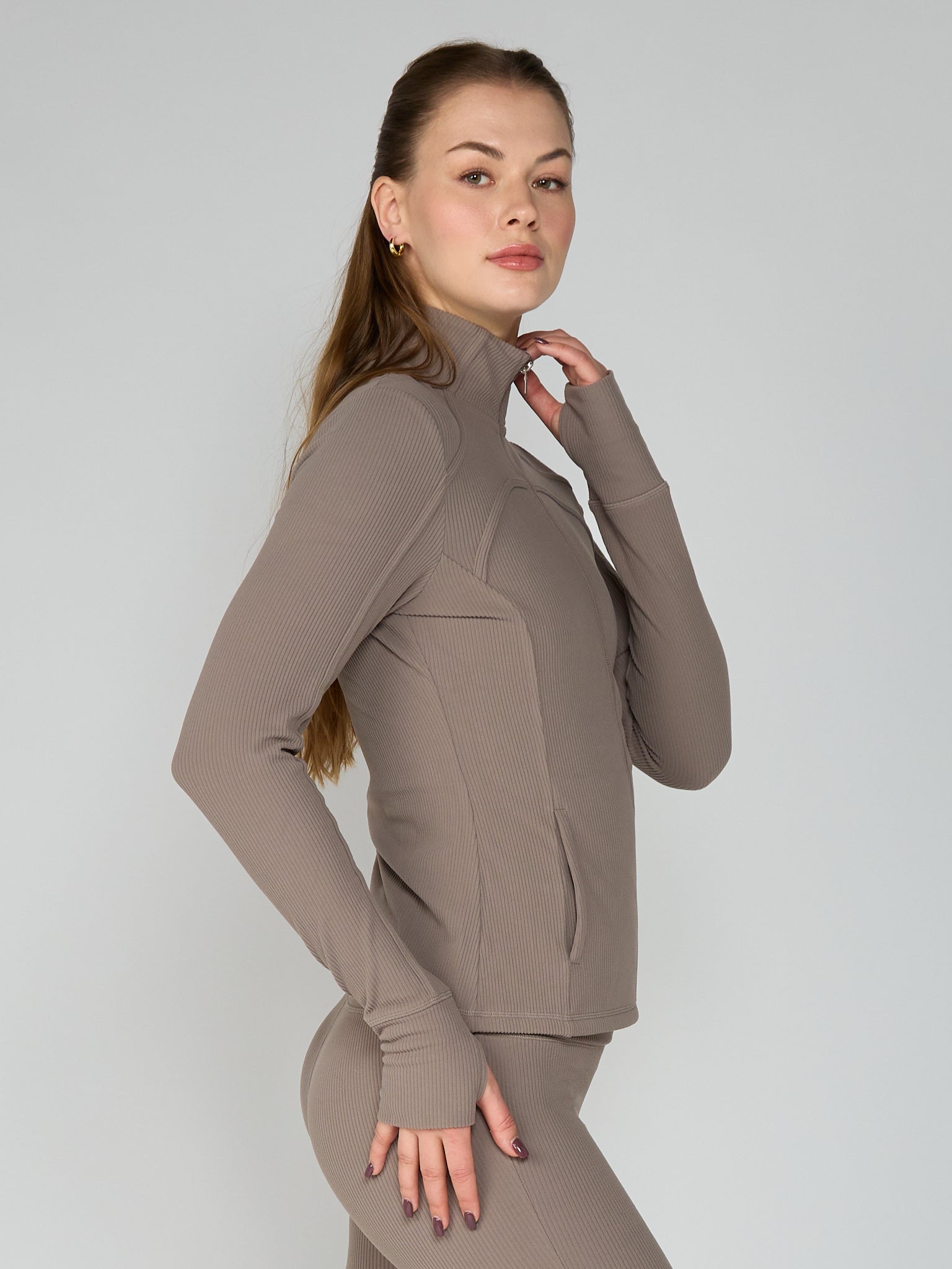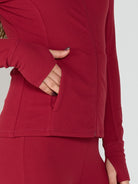 Functional Sport Details: Features thumbholes, secure zippered pockets, and a high collar for added coverage and convenience.